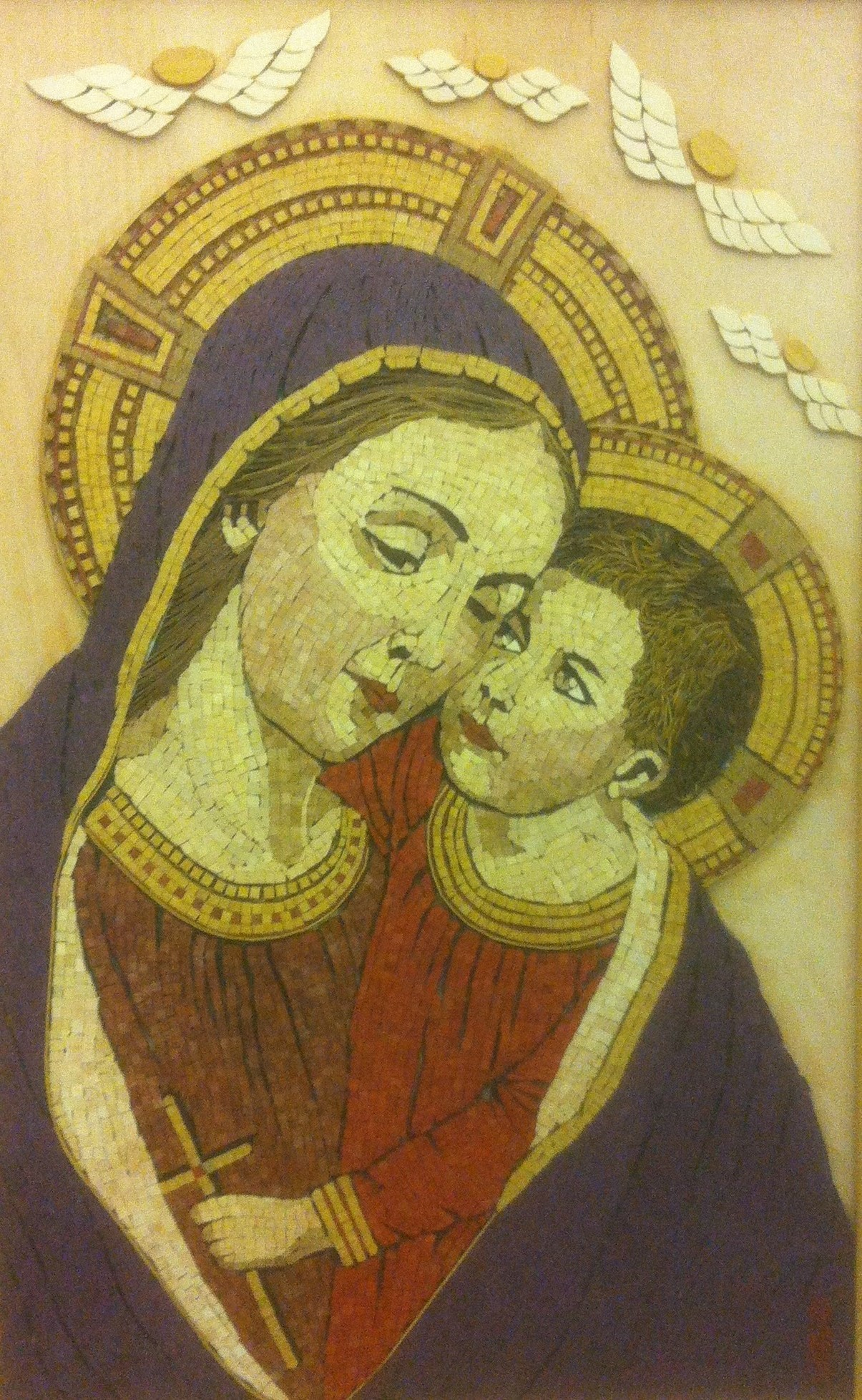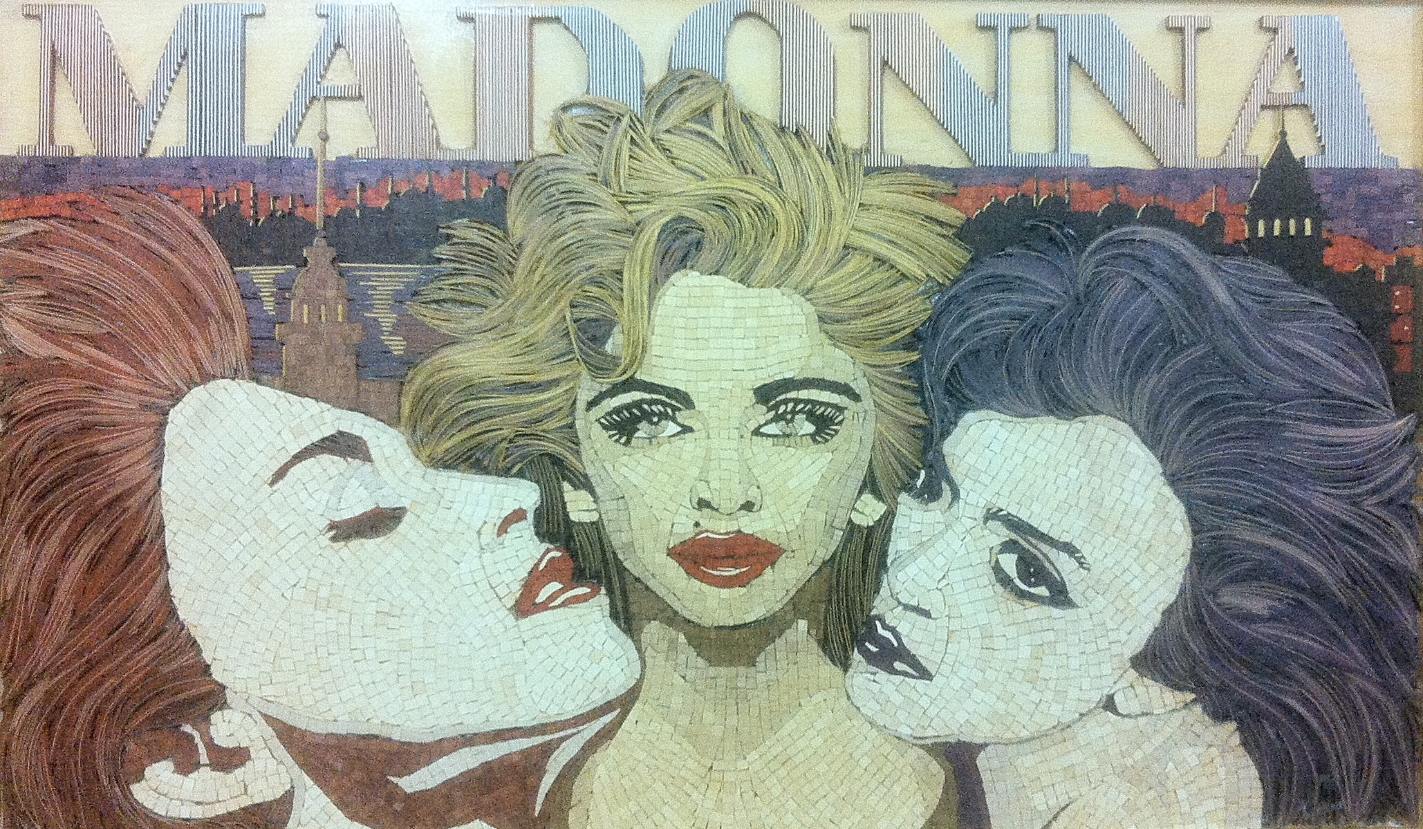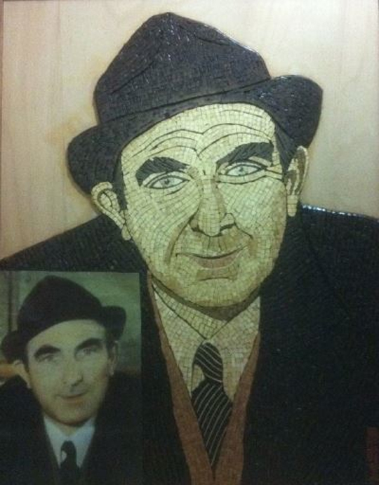 Ahşapkari–the name I’ve given it–is a work of art composed of natural colored wooden pieces. The color of the pieces are entirely natural; they are not painted, stained, or otherwise colored. In the creation of Ahşapkari, wooden pieces of different species and colors are generally cut into 6 mm. cubes. The design for the artwork is drawn on a wooden counter and the cut pieces are glued to their appropriate place with white furniture glue. To form representations of things like hair, moustaches, eyelashes and beards, wooden veneer is used vertically in 6 mm. cords. After pasting, filling varnish is put on the painting. When it dries, it’s rubbed by sandpaper. The last step is the application of clear varnish as a means of protection.