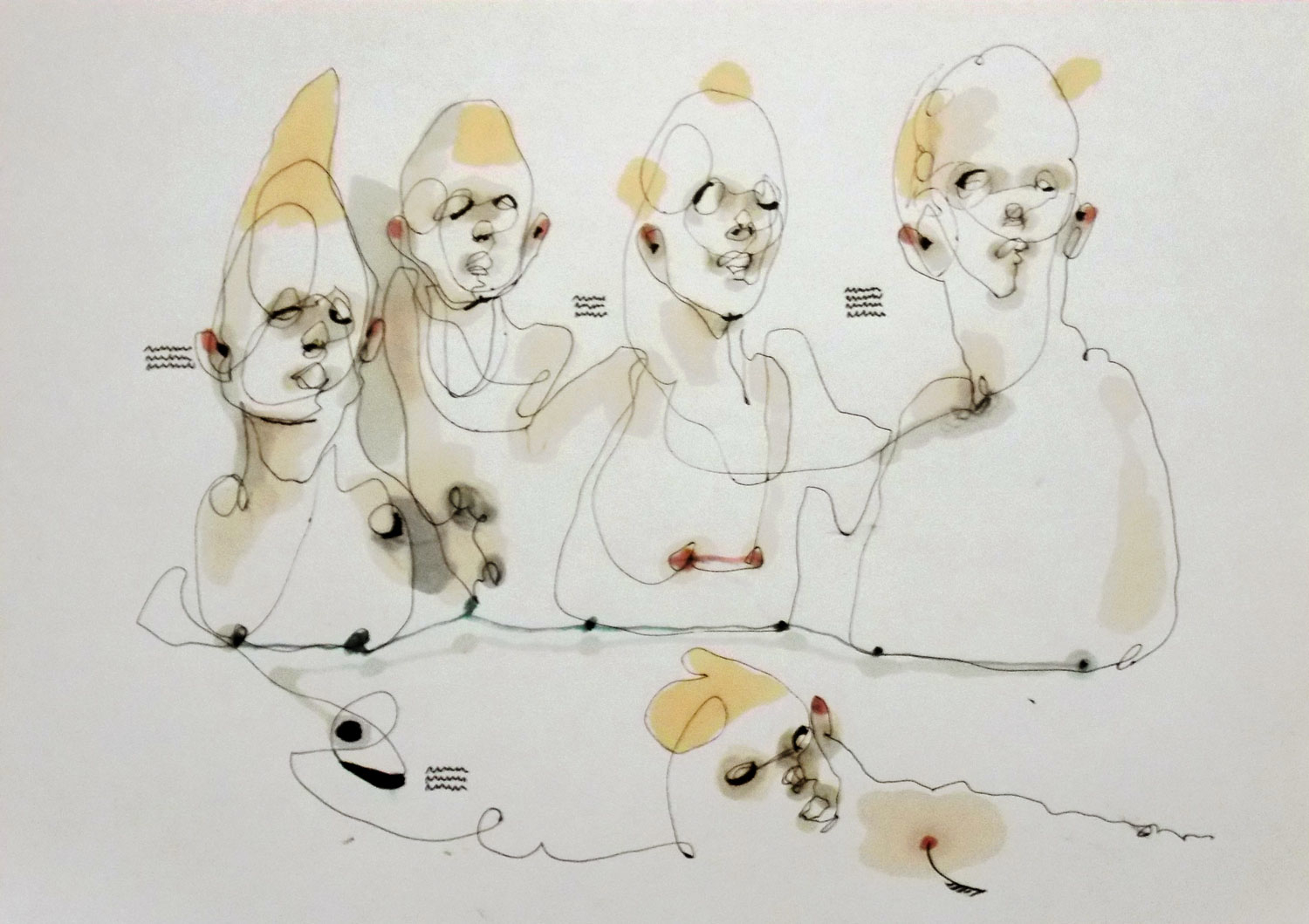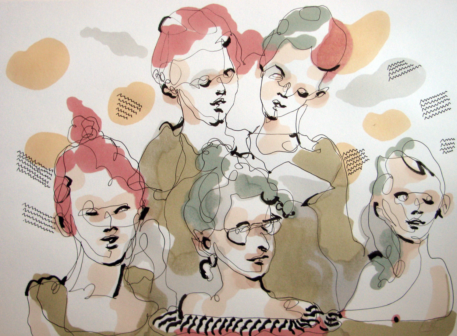 Eleanor: For me the potential to work virtually with an artist whose work I felt a real connection to was incredibly exciting. The idea that we could both create portraits of one another, despite having never met, was one I really wanted to explore. So, the project began with us agreeing on some concepts, that we would both begin with a photograph of ourselves and from this draw a self-portrait. We’d then send this drawing to the other artist who would create a portrait from it, before it was sent back and so on, until we had a set of ten portraits, five of each artist. Neither artist was able to see the original photograph, so that the portraits developed solely from the other artist’s lines.