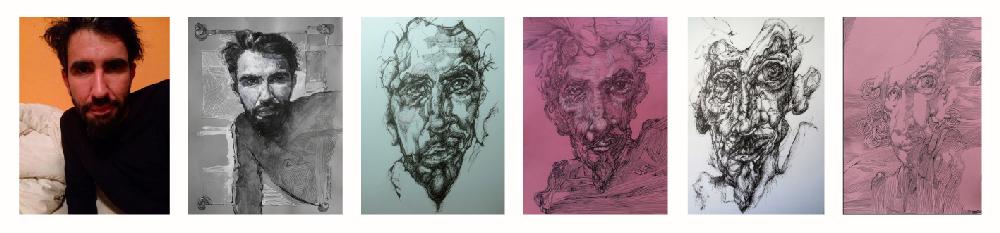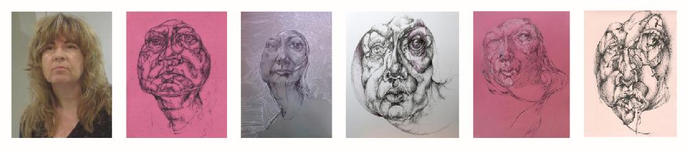 Both artists began by creating a self portrait taken from a photograph that was kept hidden from the other. This self portrait was then forwarded to the other artist who created a new portrait from the image. Once completed, this got sent back to the original artist who created a further portrait from that. This rotation continued until a series of 10 portraits in all were completed, five of each artist. As neither artist was able to see the original photograph, the portraits developed solely from the other artist’s interpretation.