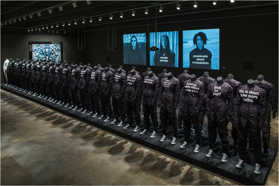 Wendy Red Star’s socially critical installation draws inspiration and employs imagery from growing up on the Crow Indian Reservation in south-central Montana. Historic photographs and regalia are juxtaposed with tapestries, text, and objects she has constructed to re-humanize a past tribal leader whose image has been appropriated for commercial use. Photographs of Chief Medicine Crow (c. 1848-1920) were taken in Washington, D.C., when he and four other tribal leaders were coerced into signing a treaty ceding a portion of tribal lands to the United States Government. His image has frequently been used to represent a stereotypical, nameless, Indian “brave.” Red Star’s newest installation is an extension of her earlier work, which employed gender-focused, political self-imagery, not unlike the art of Cindy Sherman, Ana Mendieta, and Frida Kahlo, to draw attention to the marginalization of Native Americans.-http://portlandartmuseum.org/exhibitions/apex-wendy-red-star/