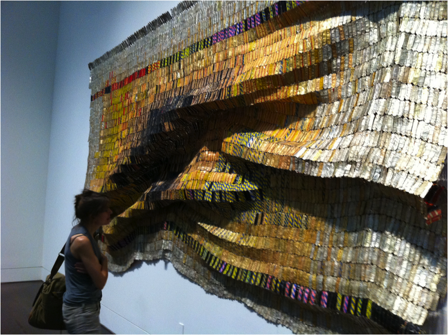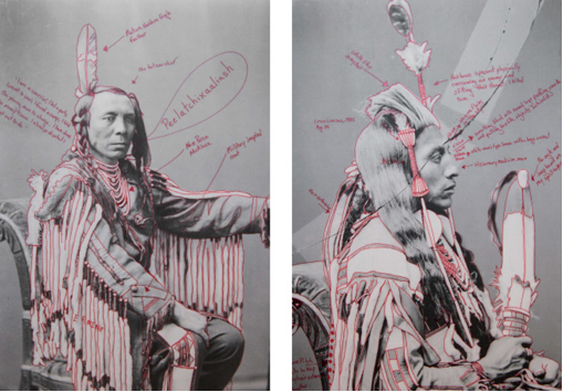 Wendy Red Star’s socially critical installation draws inspiration and employs imagery from growing up on the Crow Indian Reservation in south-central Montana. Historic photographs and regalia are juxtaposed with tapestries, text, and objects she has constructed to re-humanize a past tribal leader whose image has been appropriated for commercial use. Photographs of Chief Medicine Crow (c. 1848-1920) were taken in Washington, D.C., when he and four other tribal leaders were coerced into signing a treaty ceding a portion of tribal lands to the United States Government. His image has frequently been used to represent a stereotypical, nameless, Indian “brave.” Red Star’s newest installation is an extension of her earlier work, which employed gender-focused, political self-imagery, not unlike the art of Cindy Sherman, Ana Mendieta, and Frida Kahlo, to draw attention to the marginalization of Native Americans.-http://portlandartmuseum.org/exhibitions/apex-wendy-red-star/